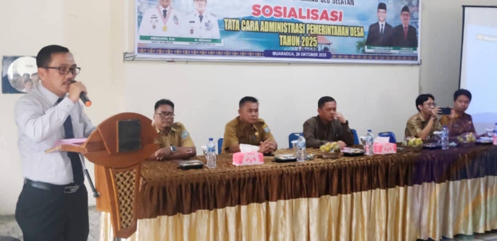 MUARADUA - Pemerintah Kabupaten (Pemkab) Ogan Komering Ulu Selatan (OKUS) melalui Dinas Pemberdayaan Masyarakat dan Desa (PMD) menyelenggarakan kegiatan Sosialisasi Tata Cara Administrasi Pemerintahan Desa di Aula Hotel Samudra, Muaradua, Senin (20/10/2025).