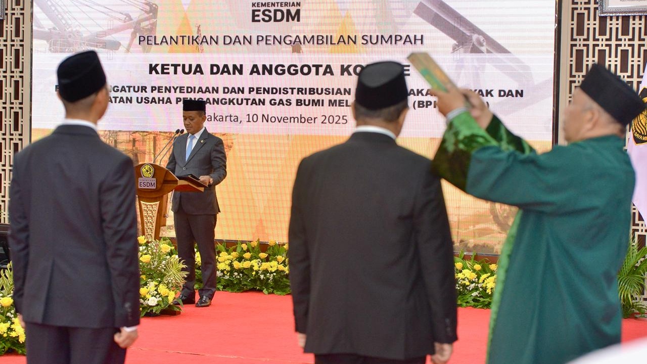 JAKARTA - Menteri Energi dan Sumber Daya Mineral (ESDM), Bahlil Lahadalia, pada hari ini, Senin (10/11), secara resmi melantik Ketua dan Anggota Komite Badan Pengatur Penyediaan dan Pendistribusian Bahan Bakar Minyak dan Kegiatan Usaha Pengangkutan Gas Bumi Melalui Pipa (BPH Migas) di Kantor Kementerian ESDM Jakarta.