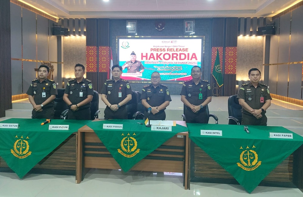Kejaksaan Negeri OKU Timur menggelar press release Hari Anti Korupsi Sedunia (HAKORDIA) tahun 2025 dan capaian kinerja bidang pidana khusus di Aula Kejaksaan Negeri OKU Timur, Selasa 9 Desember 2025.--